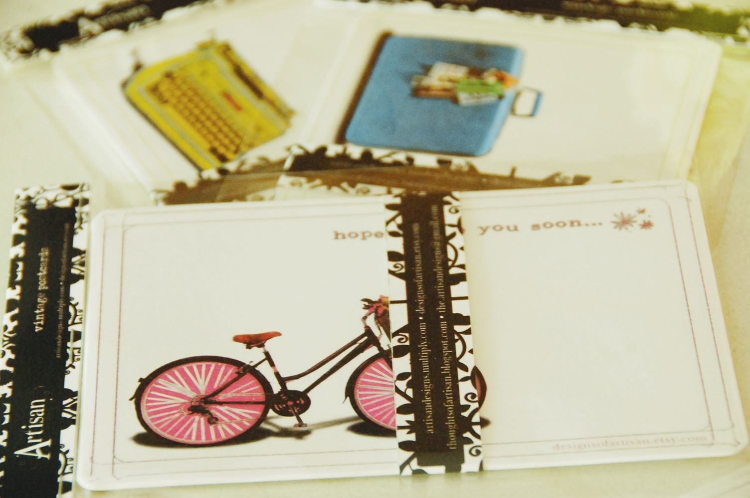 These are my new vintage collection postcards, and you can check them in my Etsy shop. They are made of #250gsm matte paper, digitally printed with curve ends and they are made and packed with love and care. It has 3 designs {bicycle, luggage and typewriter}.